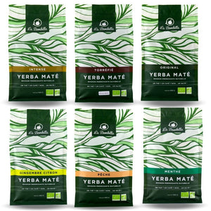 Profite de la douceur du maté pêche 🍑, la puissance du maté Gingembre-Citron 🍋, la fraicheur du maté Menthe ❄️, l'équilibre du Maté Original 🌱, la puissance du Maté Intense 🔥 et l'arôme proche du cacao du Maté Torréfié 🍫.